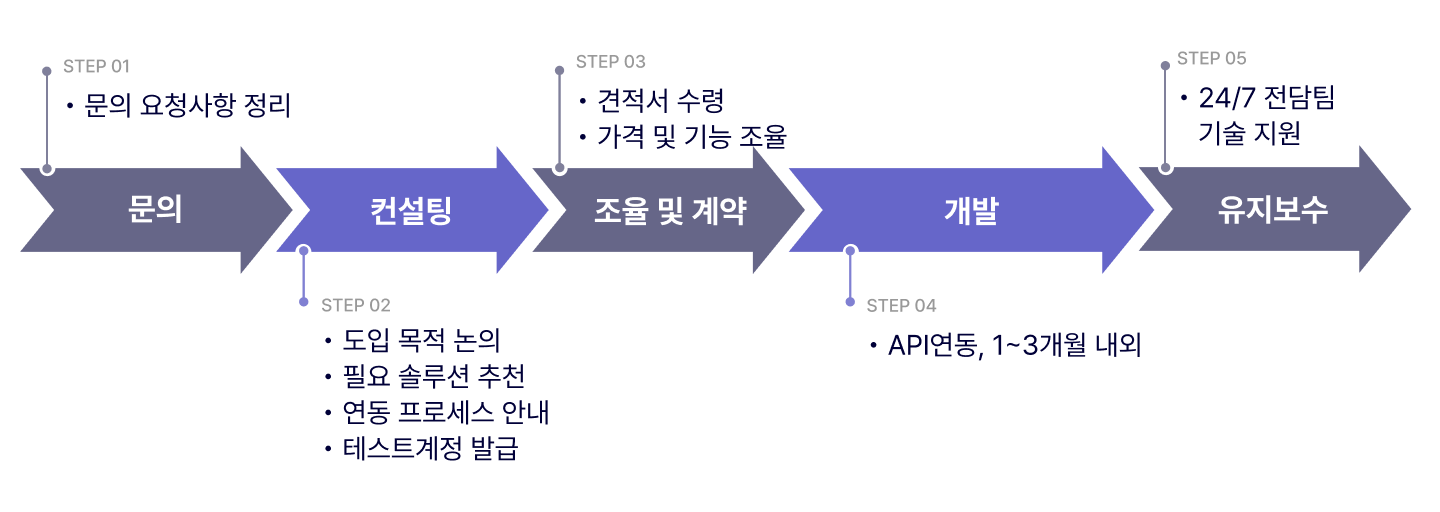 별도 서버 구축 없이 API 연동만으로 비대면 본인확인을 시작할 수 있습니다.